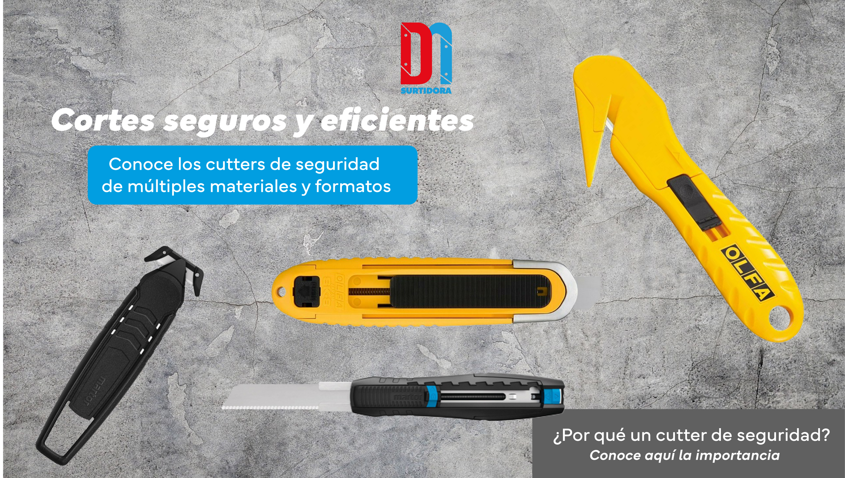 Somos una surtidora con una amplia variedad de cutters estándar, cutters de seguridad, herramientas de corte especializadas, navajas industriales y más.